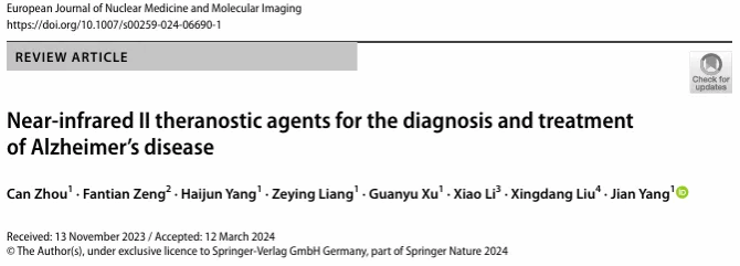 近日,国产亚洲精品美女久久久医学院杨剑副教授团队/上海四一一医院(国产亚洲精品美女久久久附属四一一医院)在分子影像领域的TOP期刊《European Journal of Nuclear Medicine and Molecular Imaging》(中科院1区IF=9.1)上发表名为“Near-infrared II theranostic agents for the diagnosis and treatment of Alzheimer’s disease”(近红外II区分子用于阿尔茨海默症诊断和治疗的研究进展)的综述论文。近红外II区荧光成像因其独特的优势,在AD诊断和治疗方面具有巨大的潜力。基于近红外Ⅱ区荧光成像,作者对当前用于AD的诊断的近红外Ⅱ区分子探针以及基于近红外Ⅱ区分子用于AD的光热治疗及光动力治疗进行了系统性概述,探讨了在AD诊断与治疗过程中遇到的问题与挑战,并对未来AD的诊断与治疗做出了展望。